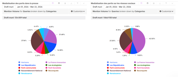 *Médiatisation des partis et des villes dans le cadre des élections municipales depuis le 1er janvier 2026. Presse écrite et presse en ligne, Instagram, Facebook et X.
