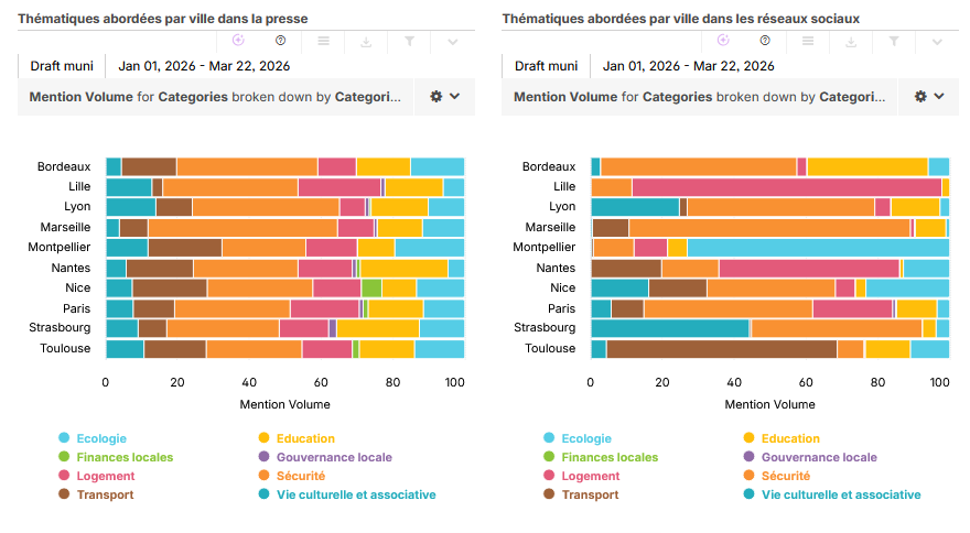 Trois villes affichent les mêmes thématiques sur les deux canaux : Paris et Lille (sécurité et logement), Nice (sécurité et transport).