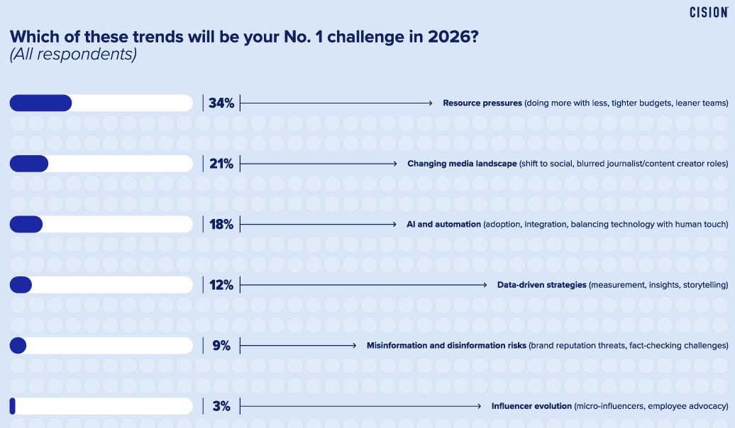 Pour plus d’un tiers des répondants (34 %), en 2026, le principal défi est la pression sur les ressources (faire plus avec moins, budgets plus serrés, équipes réduites). En entreprise, le budget communication/RP étant souvent le premier impacté par les restrictions budgétaires, cette pression est plus forte pour les professionnels des RP internalisées que pour les agences (36 % vs 27 %).