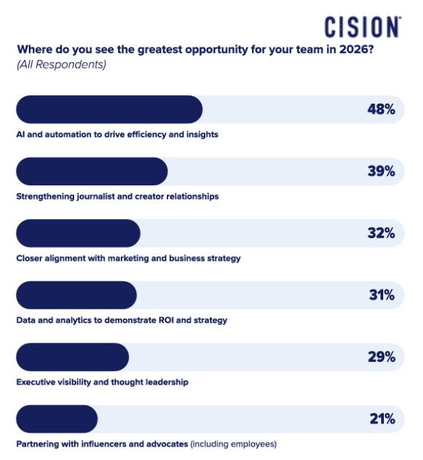 Près de la moitié des professionnels des RP (48 %) voit dans le duo IA et automatisation le plus grand potentiel de croissance pour leurs équipes en 2026. Vient ensuite le renforcement des relations avec les journalistes et créateurs (39 %). Ce qui implique que, si les outils d’IA sont reconnus pour leur faculté à libérer du temps afin de pouvoir se consacrer à la stratégie et améliorer ciblage et mesure, le lien humain demeure essentiel à une communication efficace. On note peu de différence dans les pourcentages de réponses entre agences et Relations Presse internalisées.