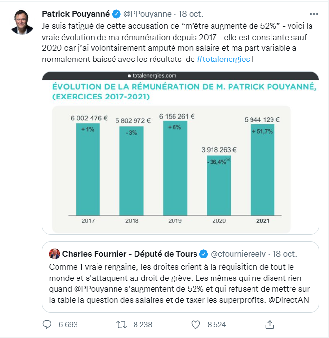 “En plein conflit social face à des salariés de TotalEnergies qui réclament une hausse de leurs salaires, Patrick Pouyanné a écrit mardi sur Twitter qu'il était "fatigué" de l'accusation selon laquelle il s'est "augmenté de 52%". Pour étayer son propos, le PDG du groupe pétrolier a publié "la vraie évolution de [sa] rémunération."- France Info