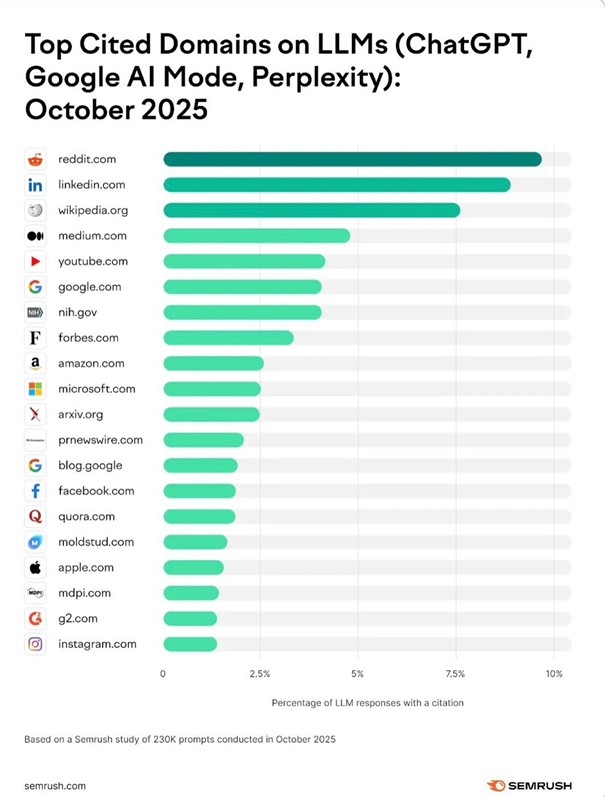 Preuve de l’importance nouvelle des relations médias dans le GEO : les communiqués de presse diffusés à travers le réseau de médias PR Newswire est entré dans le top 20 des sources des LLM et des moteurs de recherche IA (Chat GPT, Perplexity, Google AI…) d’après l’analyse de Semrush en Octobre 2025.