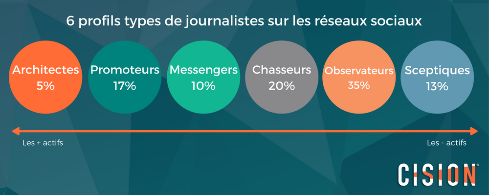 A partir des usages des réseaux sociaux par les journalistes, Cision et l’Université de Canterbury Christ Church avaient réussi à distinguer trois profils type en 2016 : les Architectes, les Explorateurs et les Sceptiques. Cette année, ils sont six : les Architectes (5%) , les Promoteurs (17%), les Messengers (10%), les Chasseurs (20%) , les Observateurs (35%) et les Sceptiques (13%).
